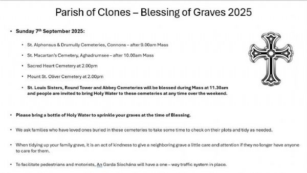 St. Louis Sisters, Round Tower and Abbey Cemeteries will be blessed during Mass at 11.30am and people are invited to bring Holy Water to these cemeteries at any time over the weekend.