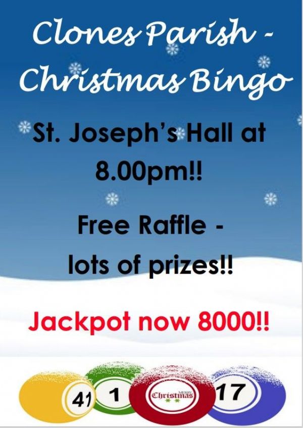 Join us for Christmas Bingo on Friday 23rd December in St. Joseph's Hall at 8.00pm. We will have a free raffle with lots of prizes!
